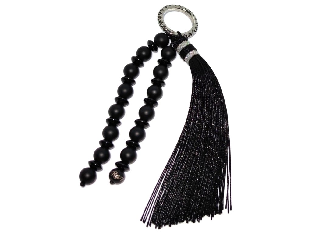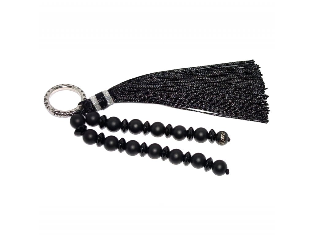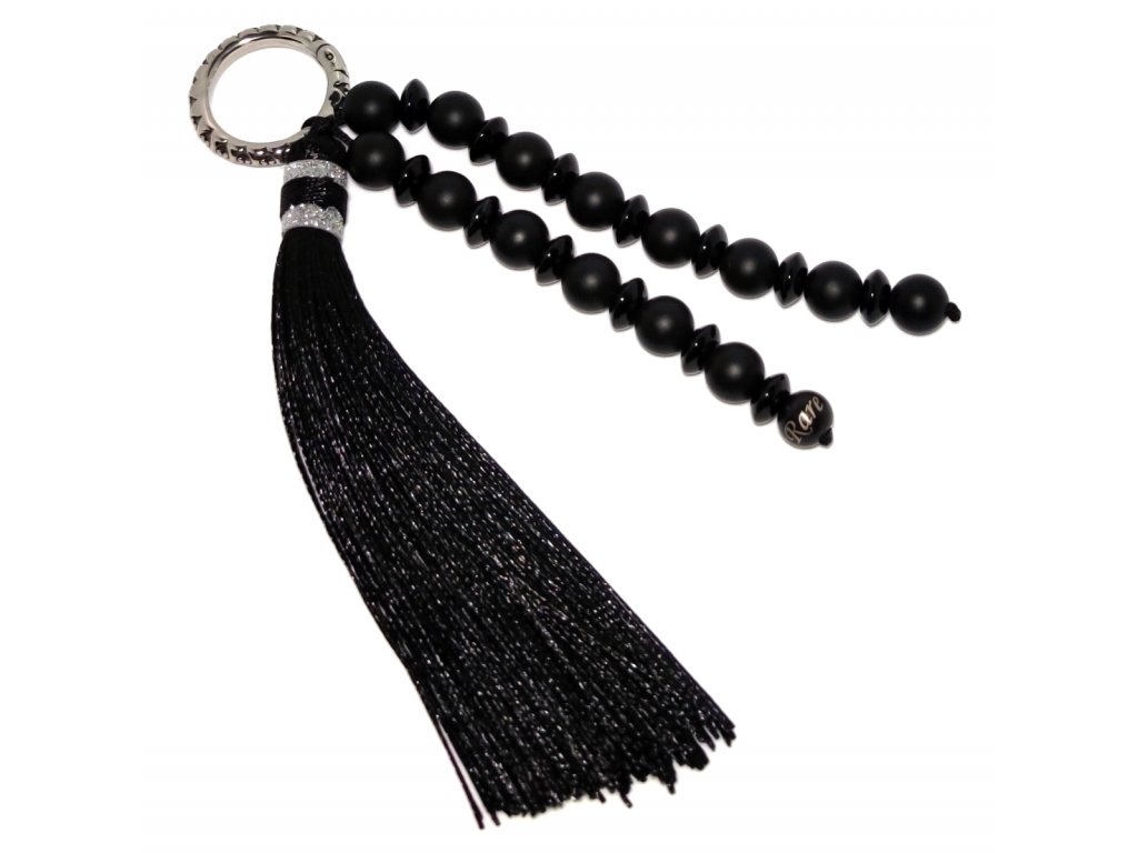 Přívěsek na klíče se skládá z korálků chirurgické oceli (zapínací karabina a logo BeRare), minerálů černého achátu v podobě rondelek a kulatých matných korálků, minerální korálky jsou doplněny výrazným střapcem z odolného nylonu.
