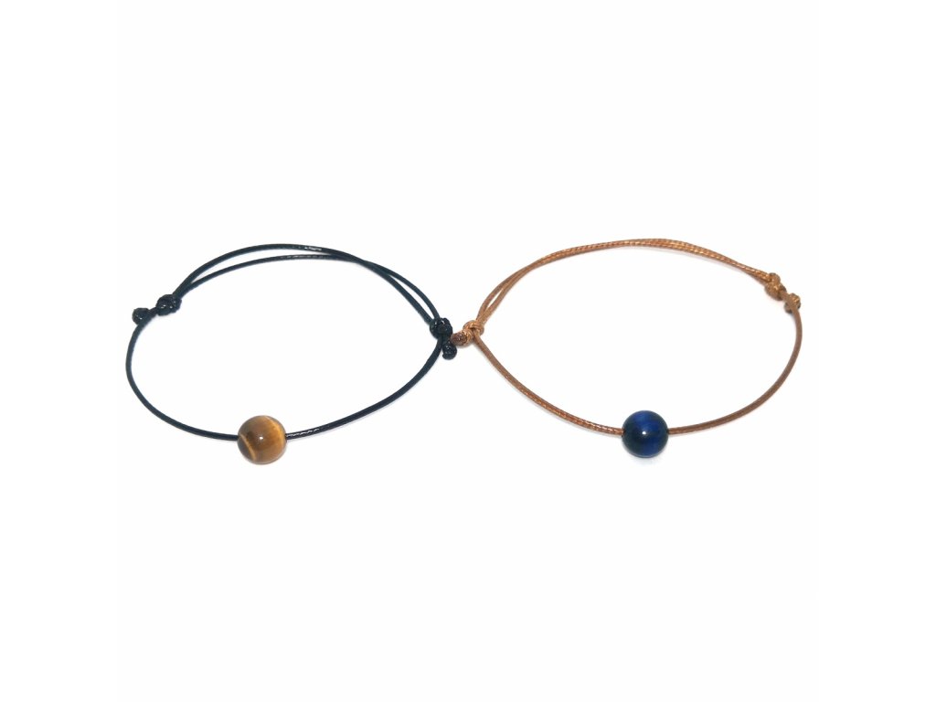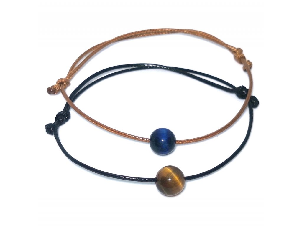 Dva minimalistické náramky pro páry, jejichž jedinými prvky jsou korálky z tygřího oka o velikosti 8mm a 7mm, které jsou navlečeny na pevný nylonový provázek. Set je vhodný darovat jako náramek přátelství.
