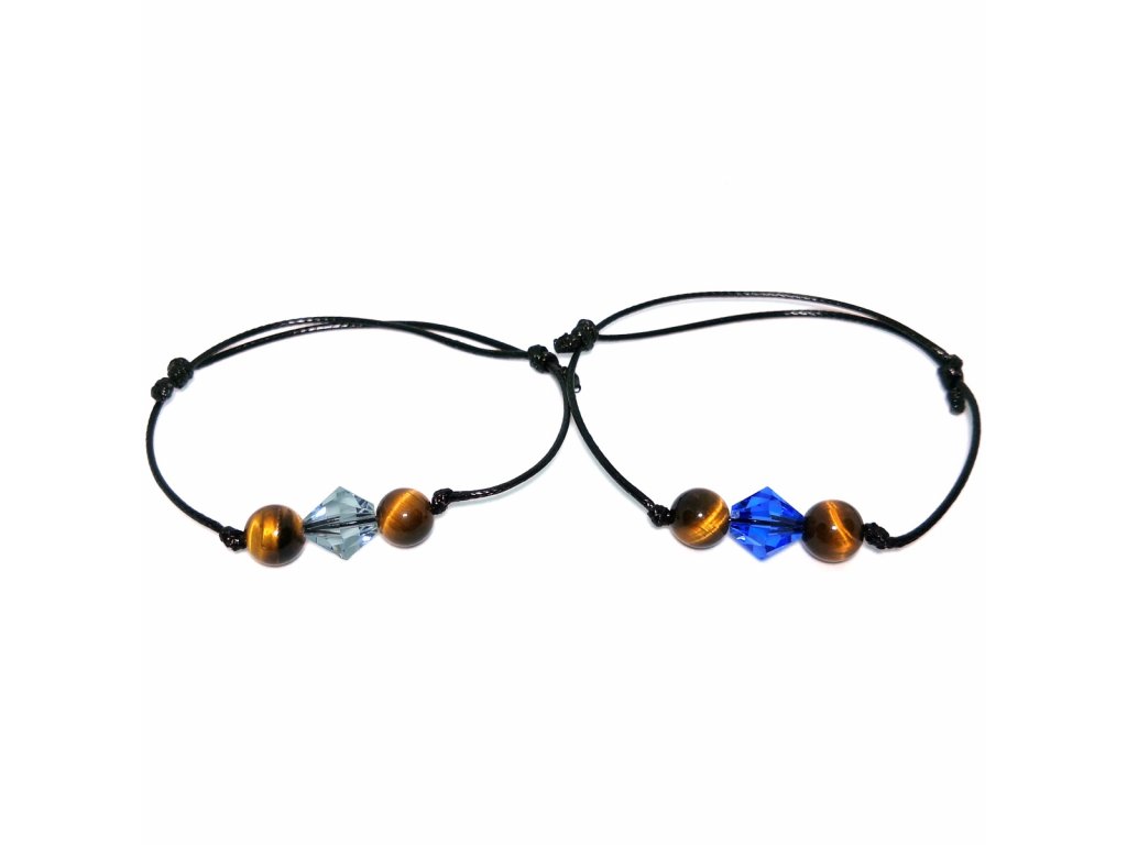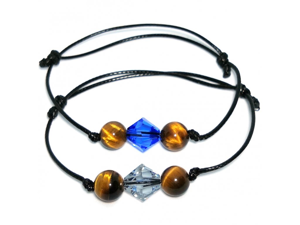 Dva párové náramky s korálky z minerálů tygřího oka nejvyšší jakosti, které jsou rozděleny sluníčkem od světoznámé značky Swarovski® v čiré barvě (dámský náramek) a modré barvě (pánský náramek). Nebo obdarujte náramkem kamarádku a vytvoříte tak náramek přátelství.