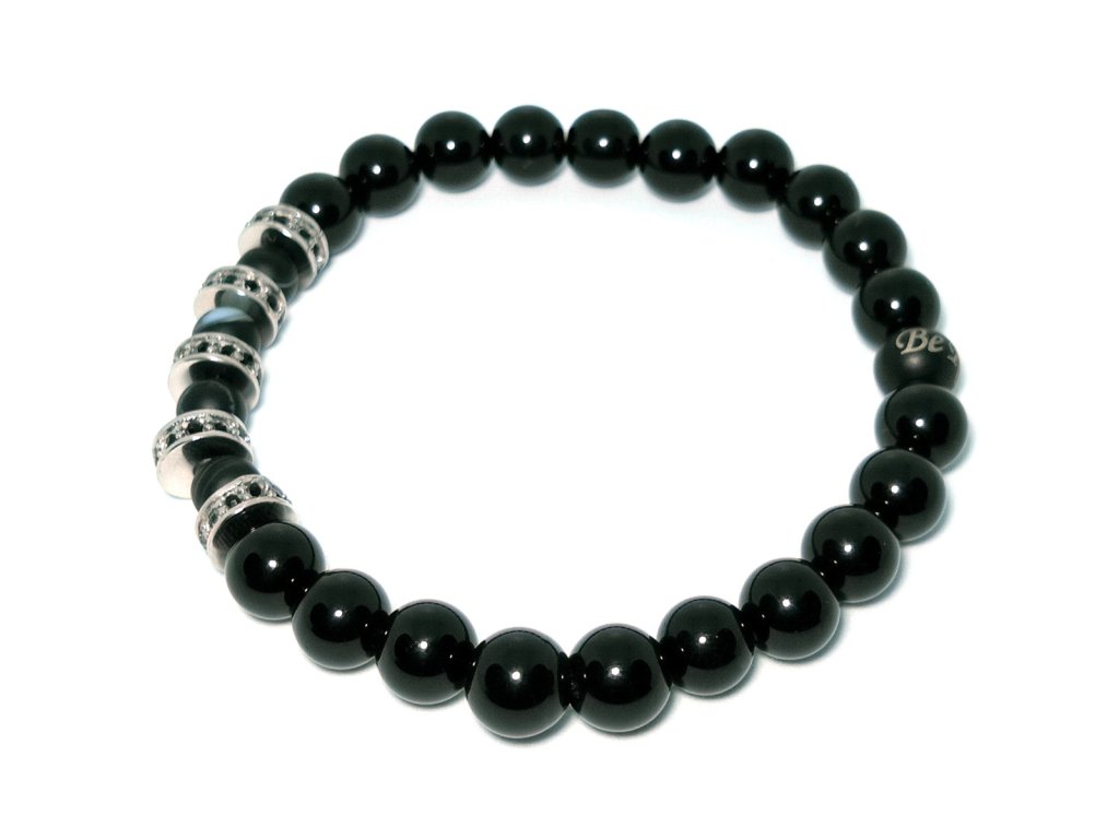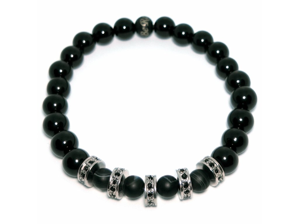 Odvážnější náramek pro pány je složen z dominantních pěti kvalitních rondelek z chirurgické oceli a černého achátu. Jako stopery jsou zde mezi rondelkami umístěny korálky černého pruhovaného achátu v menší velikosti.