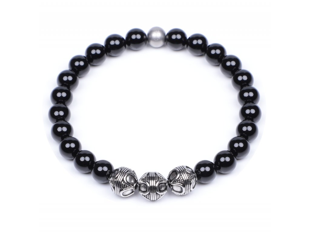 Černo stříbrný náramek se skládá ze třech 10mm korálků z chirurgické oceli a přírodních korálků achátu v TOP kvalitě AAAAAA.