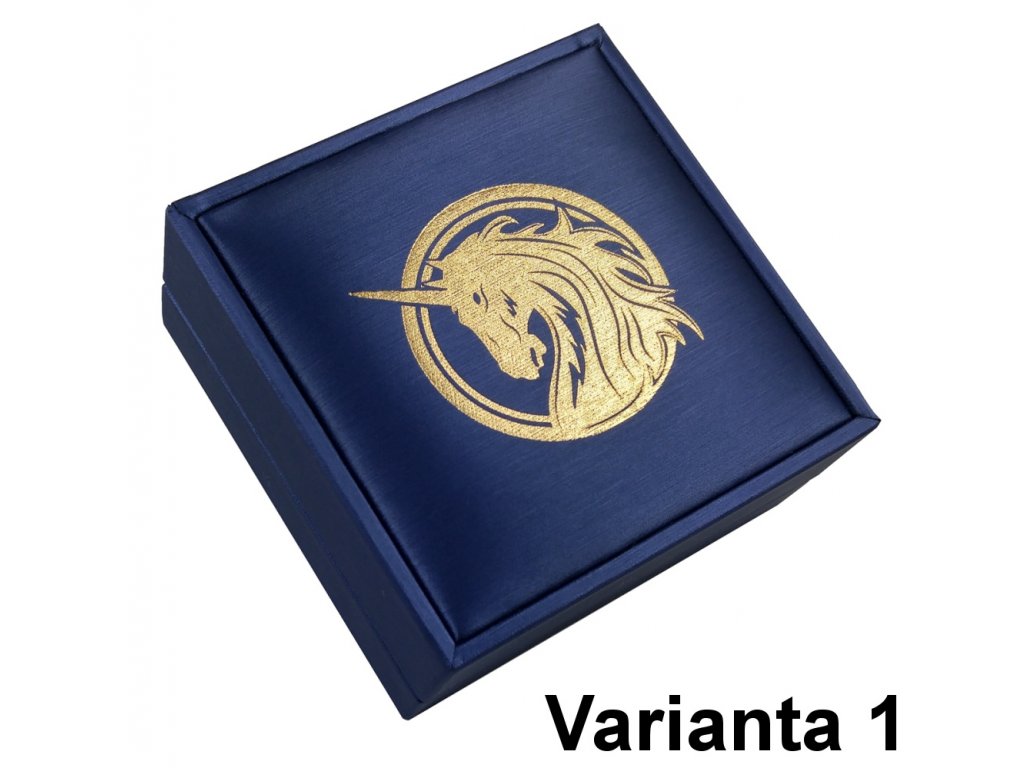 Dárková krabička na šperky je vyrobená z umělé kůže, velice příjemné na dotek a je laděná do královské modré barvy, na které je vytištěn jednorožec - zlatě se lesknoucí logo BeRare.cz