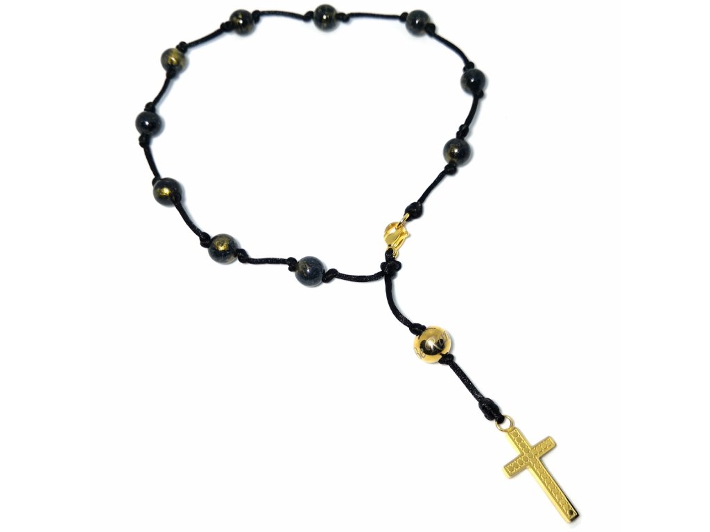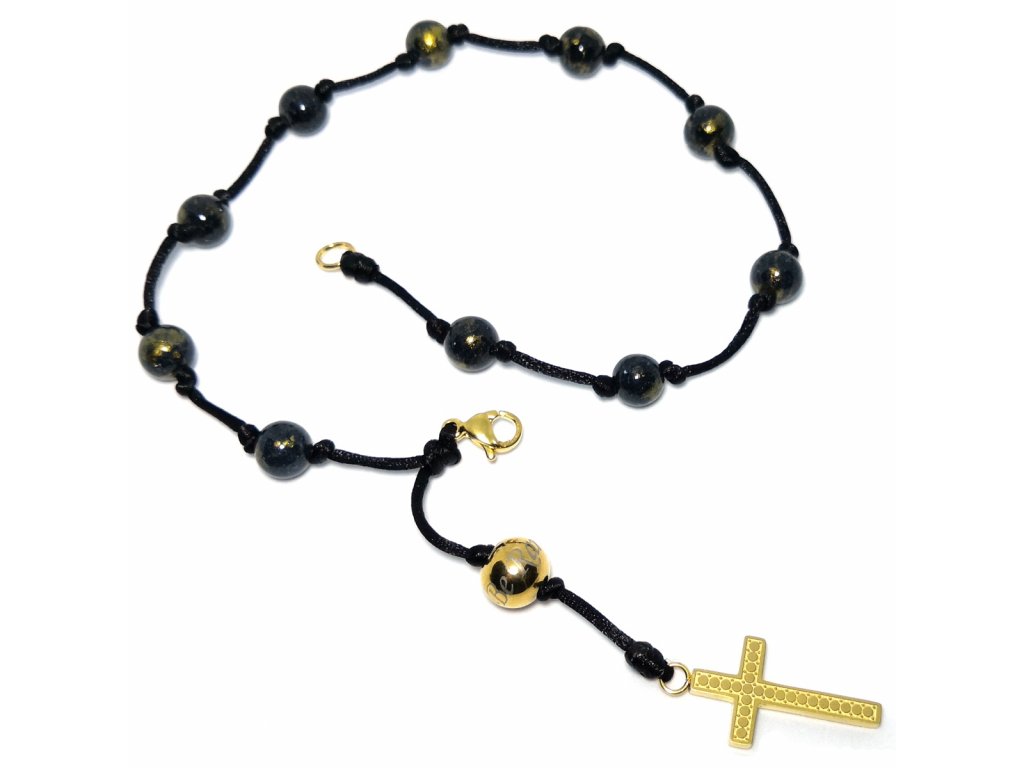 Náramek, jehož celková délka je 18,5cm, se skládá z odolné nylonové šňůrky černé barvy a minerálních korálků jadeitu, které jsou barveny a zahřívány na požadovaný efekt černo-zlaté barvy korálků.