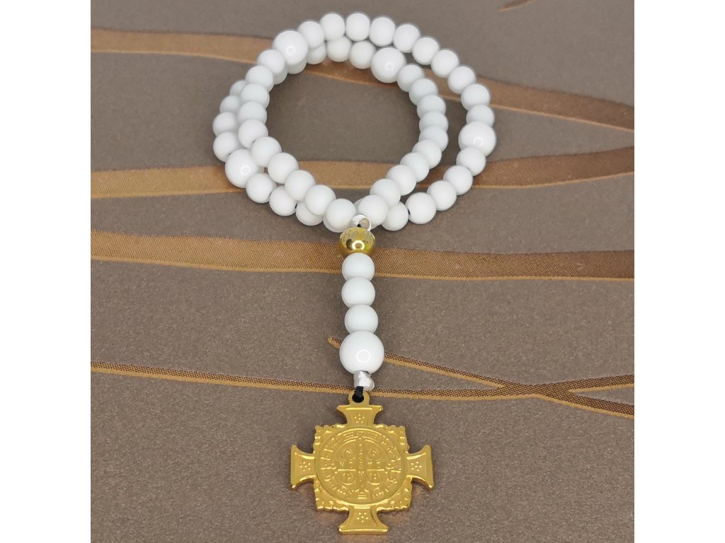 Ochranný růženec do auta (desátek) z bílého jadeitu s křížem Sv. Benedikta z chirurgické oceli. Ručně navlečený na pevném nylonu pro maximální odolnost na cestách.