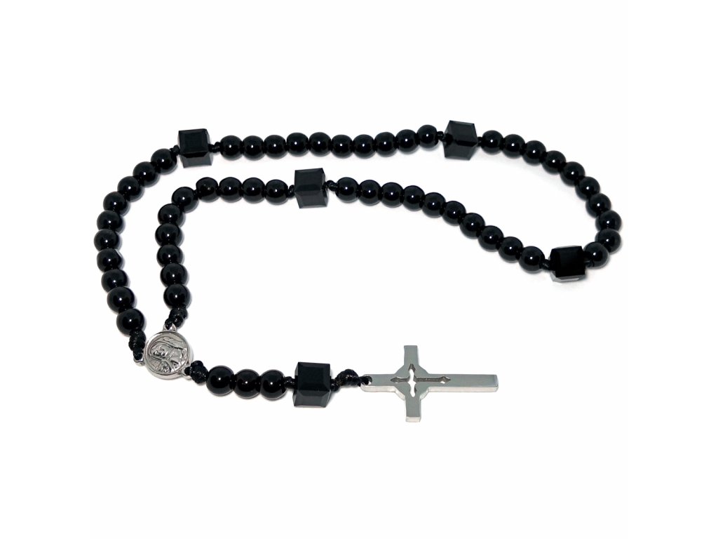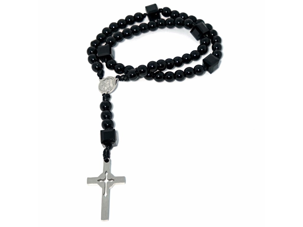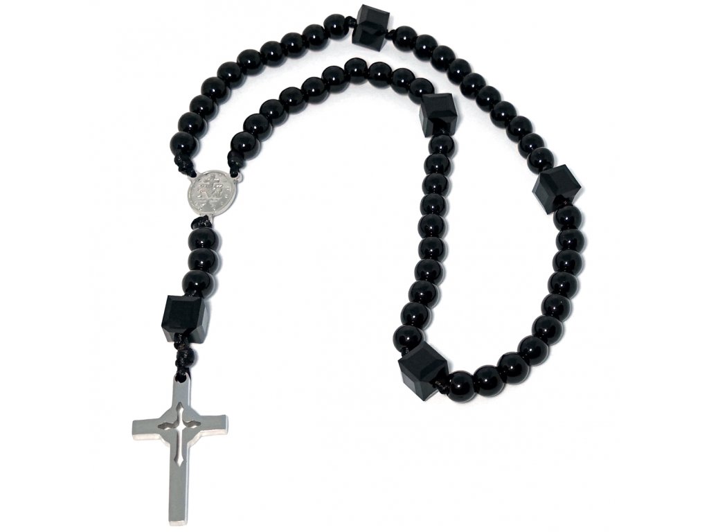 Menší černo-stříbrný růženec tvoří 6mm korálky z přírodního černého achátu a 10mm kostky Swarovski elements.