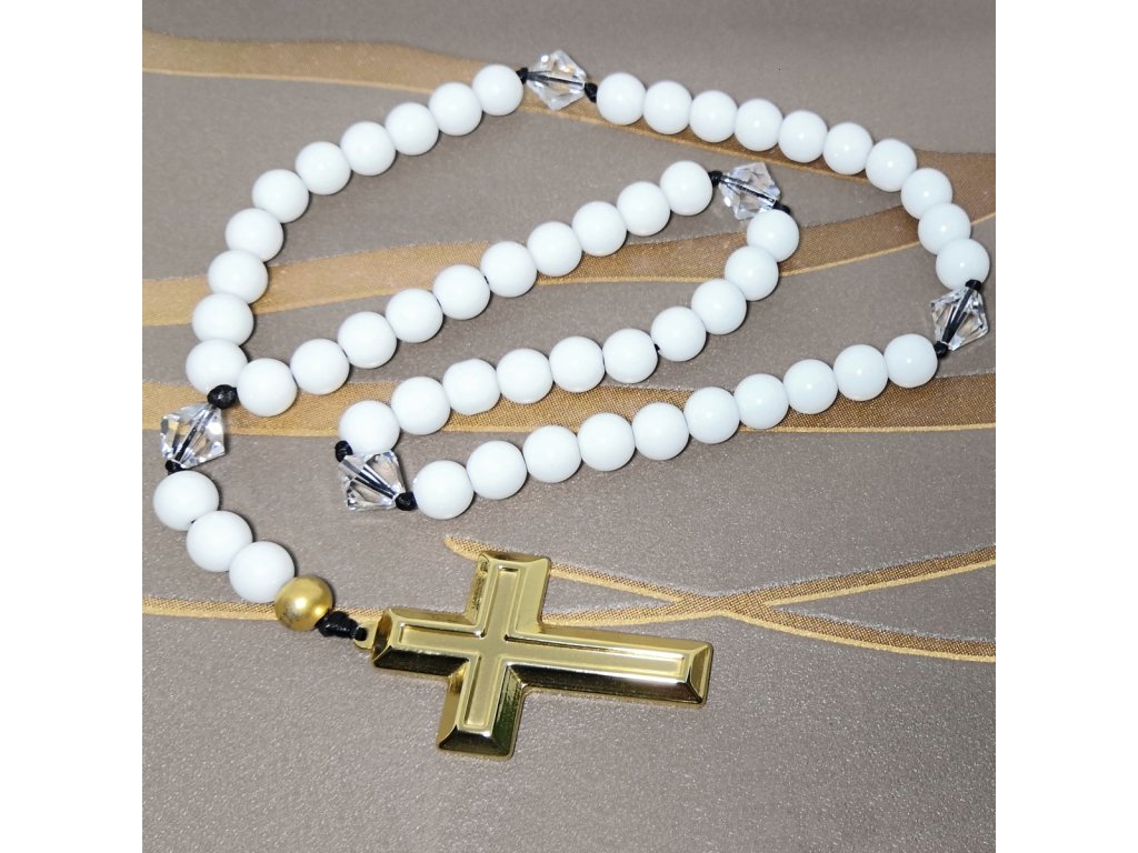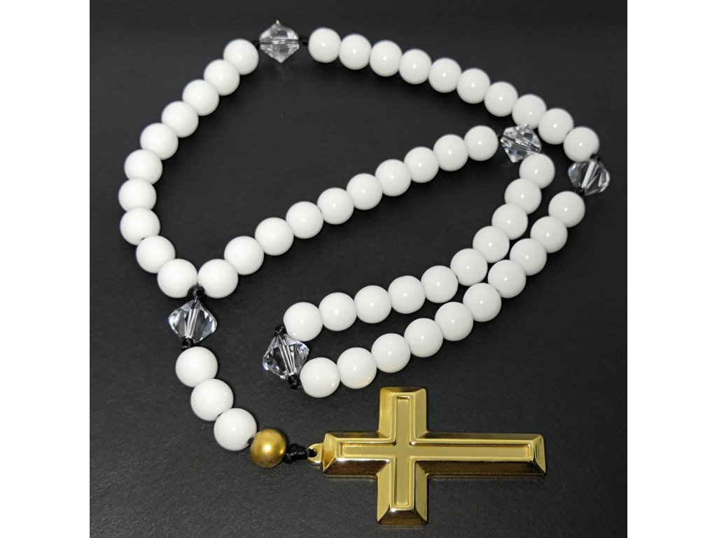 Růženec do auta se Swarovski z bileho jadeitu a chirurgicke oceli