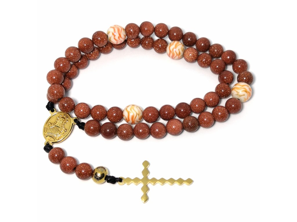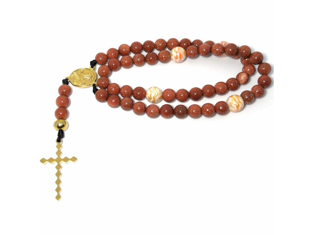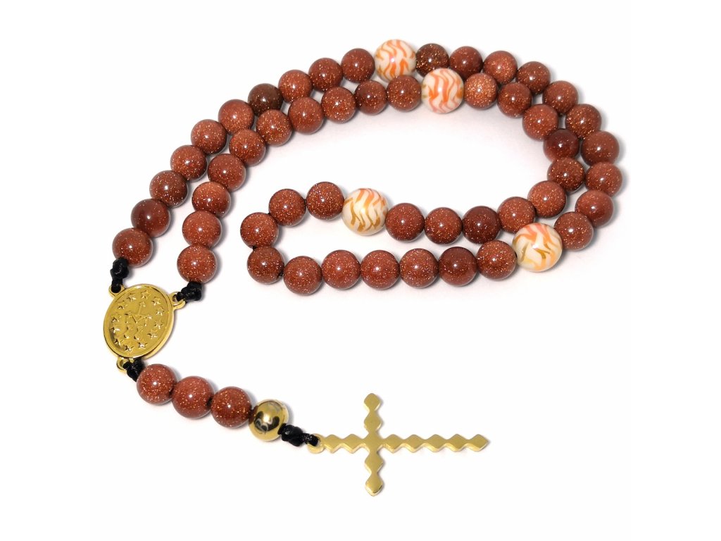 Růženec je navržen a vyroben v České republice z přírodního živce. Jako vlastní růžence slouží 10mm skleněné korálky s vlnkami nanesenými pomocí elektrolýzy.
