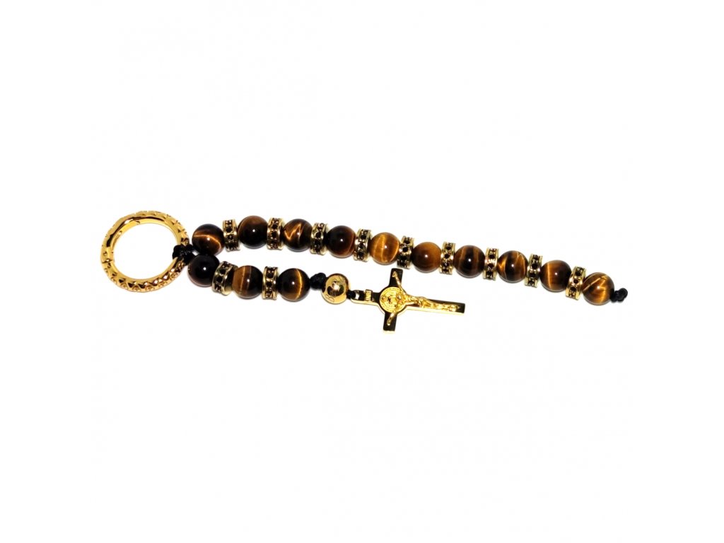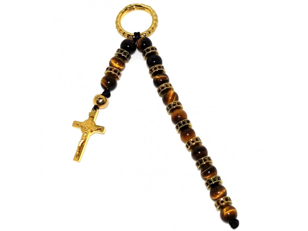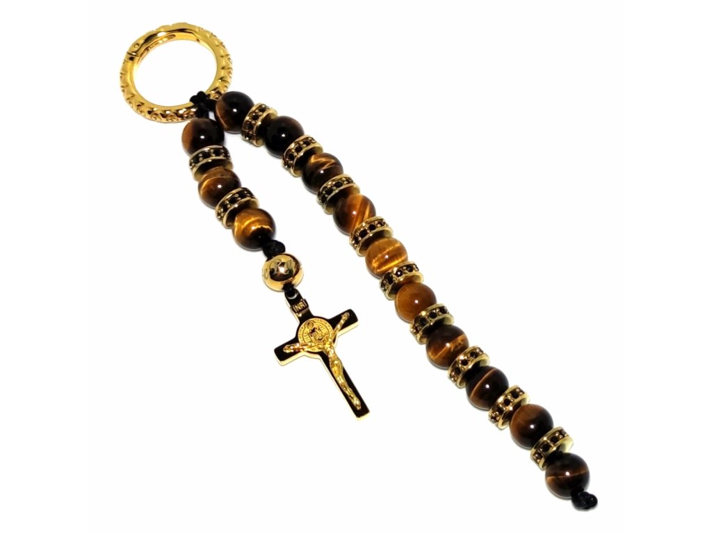 Růženec na klíče se dále skládá z minerální korálků tygřího oka, které rozdělují masivní rondele z chirurgické oceli s PVD úpravou.
