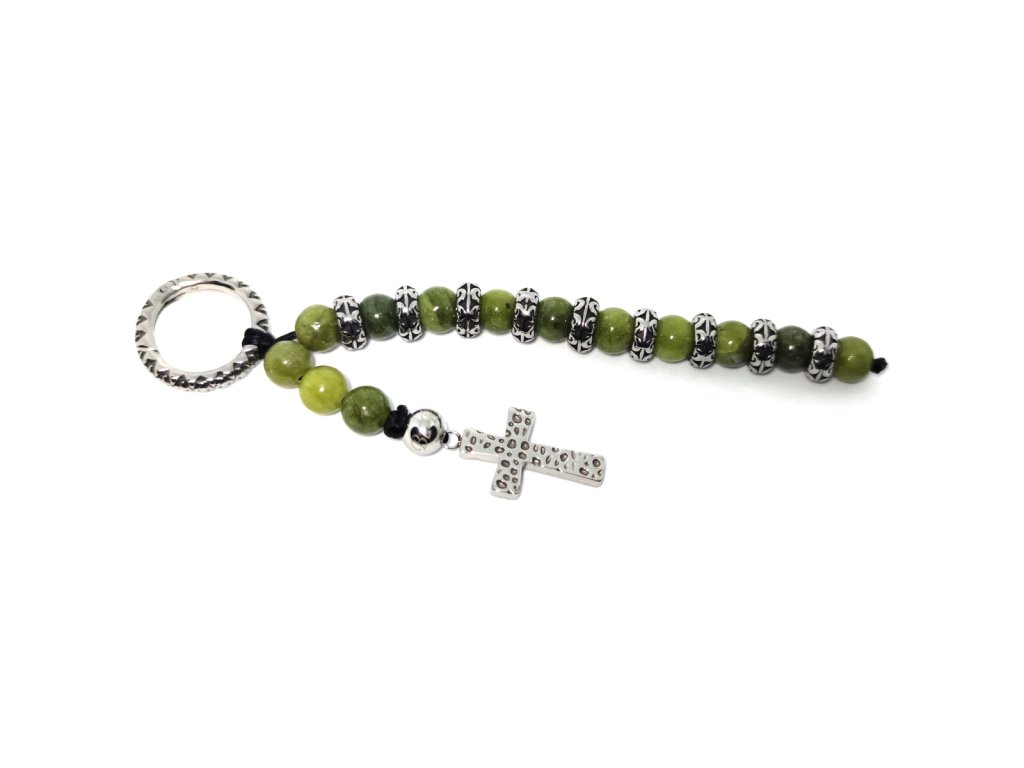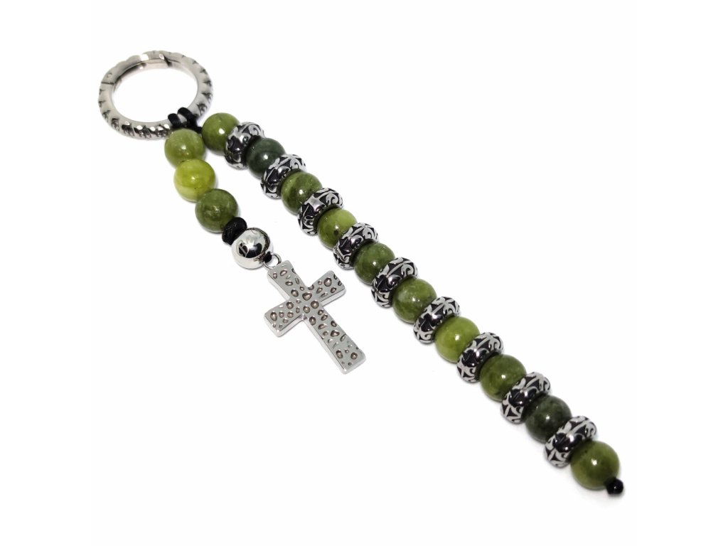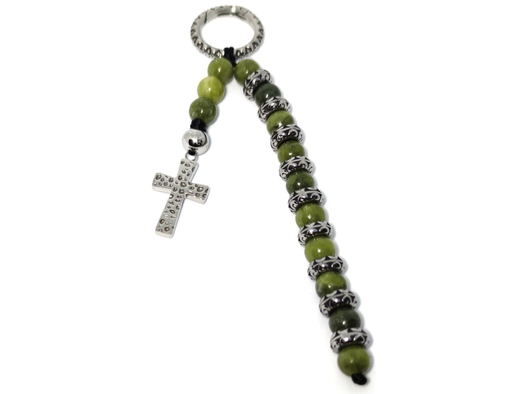 Směrem od kvalitní karabinky ke katolickému kříži jsou tři korálky z minerálu jadeitu značící úvodní modlitbu Zdrávas Maria a odlišný stříbrný prvek, kde odříkáváme modlitbu Otčenáš.