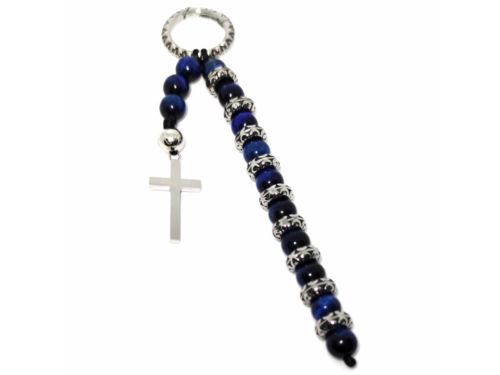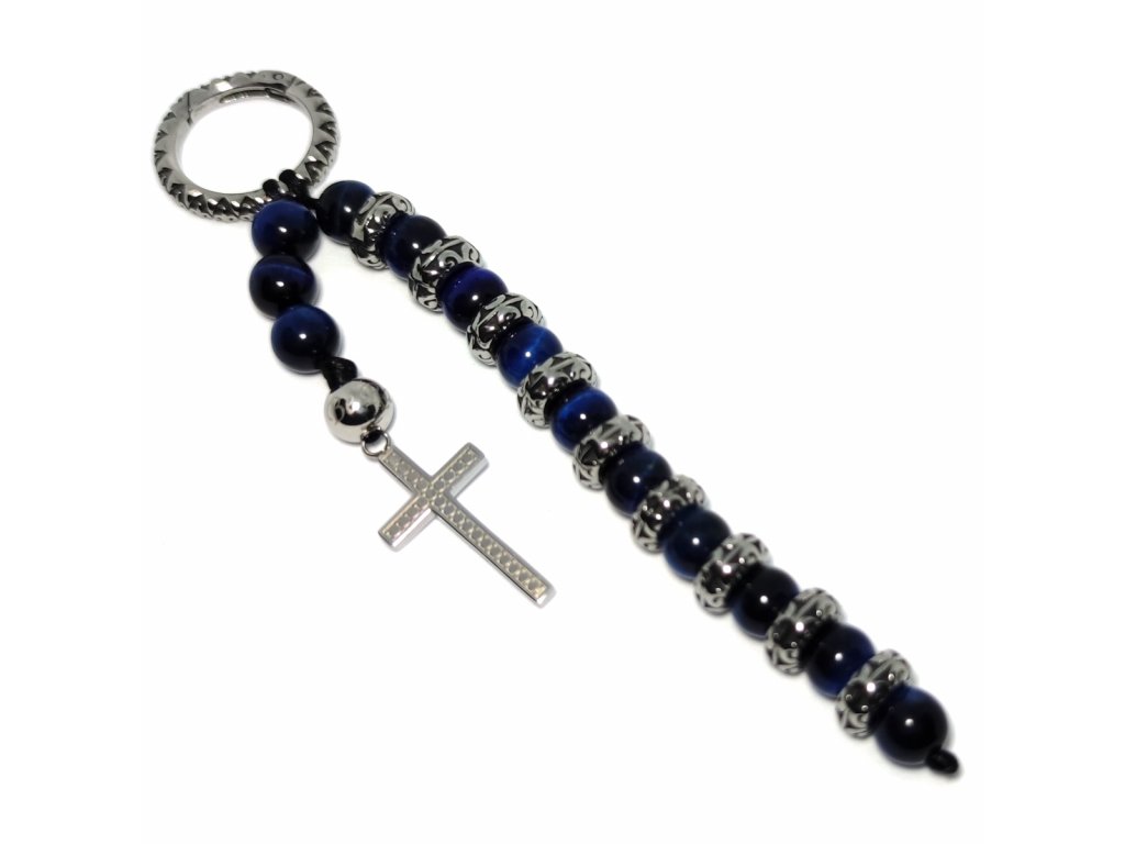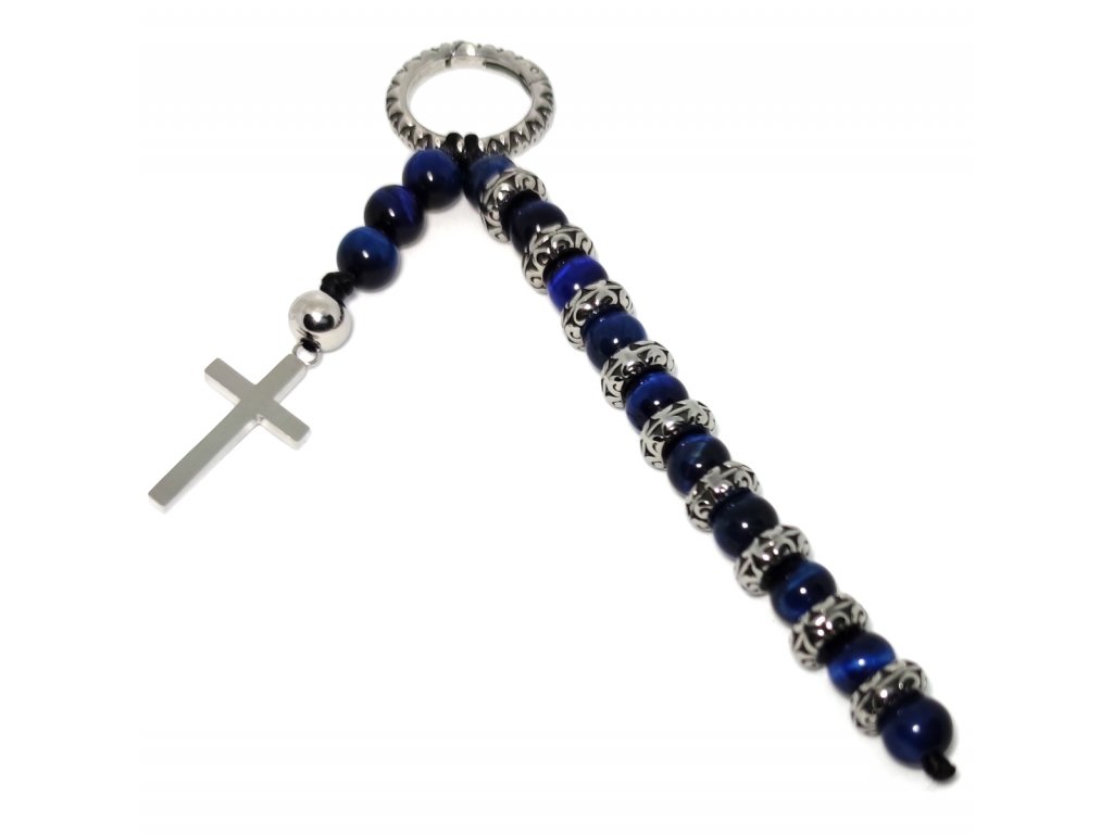 Zmenšený růženec, jehož desátek a úvodní tři korálky modlitby tvoří přírodní korálky modrého sokolího oka.