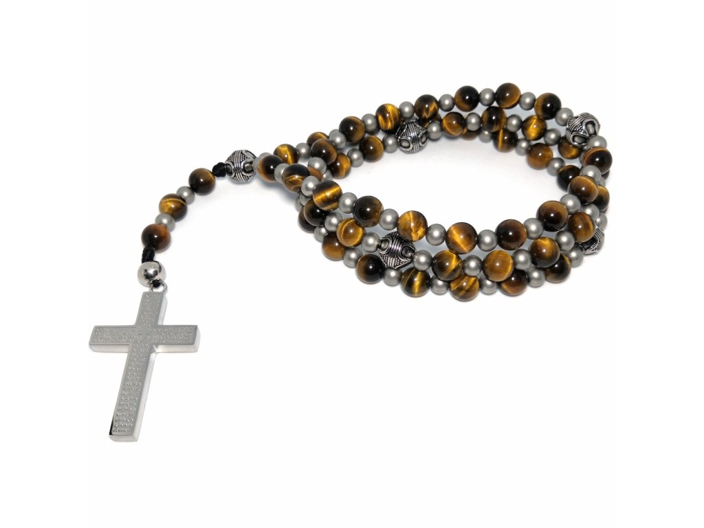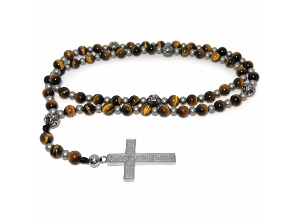 Modlitba Otčenáš (Modlitba Páně) je vytlačena pomocí techniky embossing na kvalitní chirurgickou ocel a doplňuje tak růženec složený z nejkvalitnějšího tygřího oka - přírodního minerálu s dřevěnými tóny, které při pohybu a osvětlení mění svou bohatou hnědou pestrost.