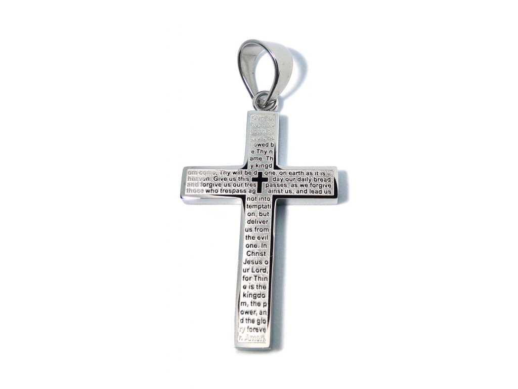 - křesťanský stříbrný lesklý kříž vystouplým textem Our Father z chirurgické oceli 46x28x4mm ve vysoké kvalitě zpracování