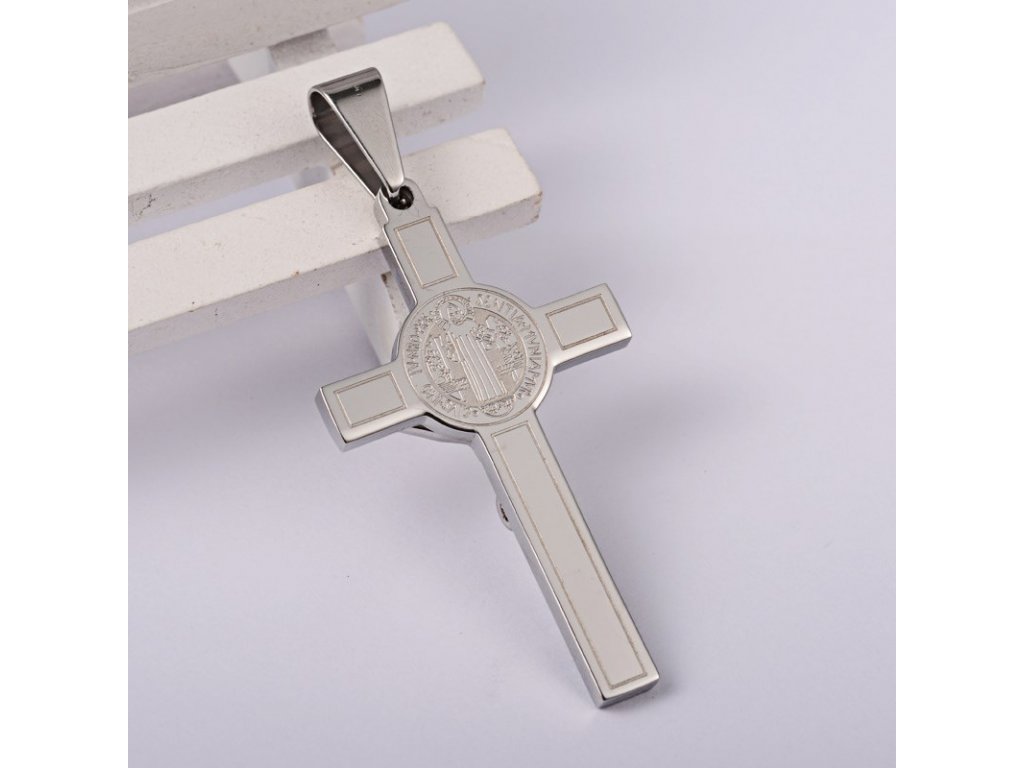 Za zády má Ježíš zobrazení medaile svatého Benedikta pro umocnění ochranné síly celého růžence. Druhá část medaile je vylaserována na druhé straně křesťanského kříže.