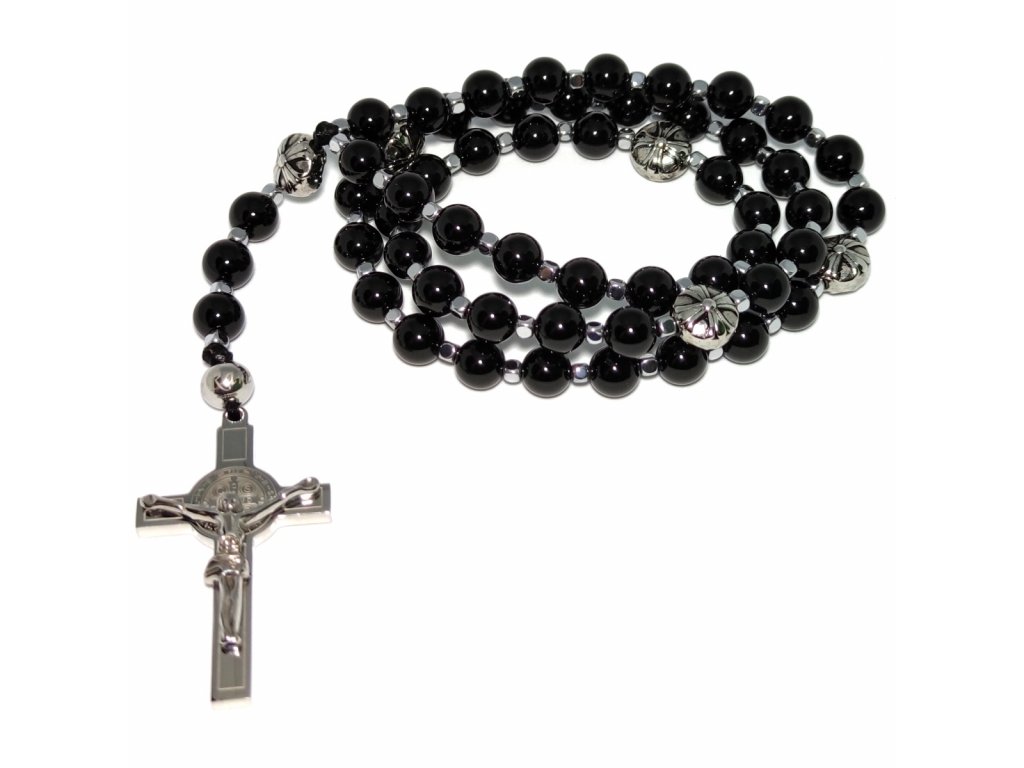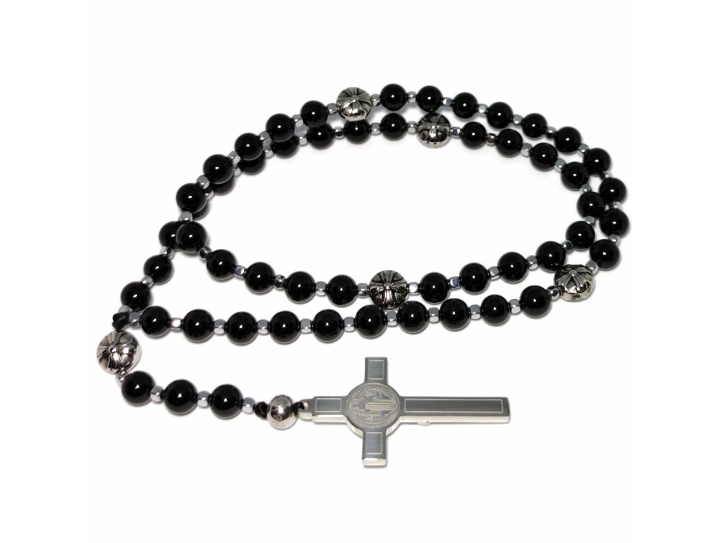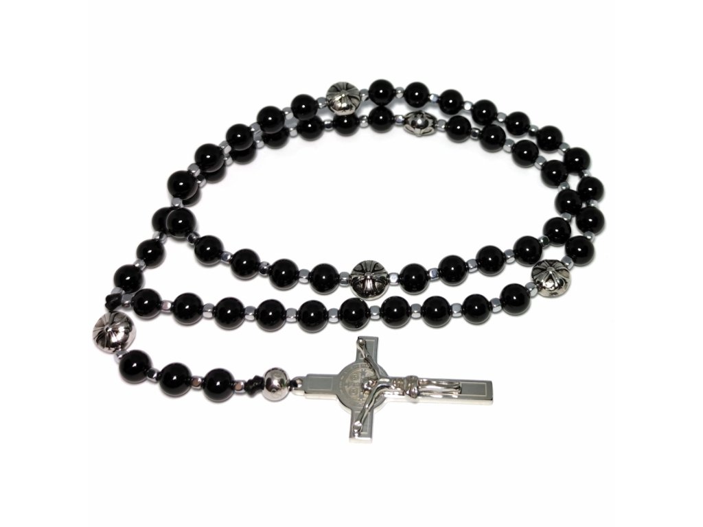 Růženec na krk černo stříbrný z chirurgické oceli, achátu a hematitu